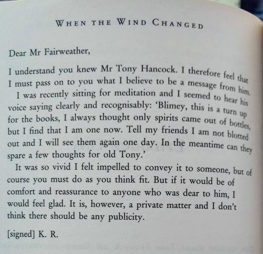 There are a couple of postcripts to the book but one was so intriguing I have to mention it here. George Fairweather was a great friend of Tony Hancock. When Hancock was delighted to find he had been chosen for the royal command performance he told George that he wished his late father could have been there to see it. George commented that perhaps his father would see it and Hancock replied dismissively that ‘only spirits come out of bottles’.