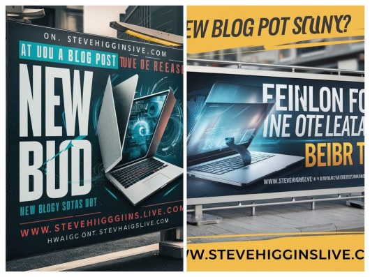 A vibrant and eye-catching roadside advertising banner, announcing the release of a “new blog post “ on “www.stevehigginslive.com” The banner features a bold, modern font, with a creative design of a laptop opening up to reveal a digital world. The background is a busy city street, reflecting the urban environment where the blog post was written.