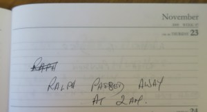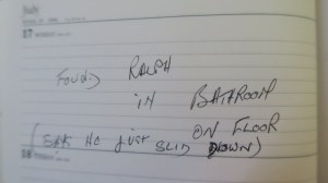 As the diary comes to April the daily entries become briefer, sometimes just one sentence about the weather. Dad’s handwriting seems to become a little less firm. It is still the same hand, sloping gently to the right but it somehow seems perceptibly weaker. On July 17th there is an entry in my Mum’s hand. She always wrote in capitals for some reason. FOUND RALPH IN BATHROOM ON FLOOR she says. He went to the doctor and they found nothing. Another entry on July 20th, again in Mum’s hand, FOUND RALPH ON FLOOR IN KITCHEN. He was taken to hospital and on the 26th July a brain scan found that he had a tumour on his brain.